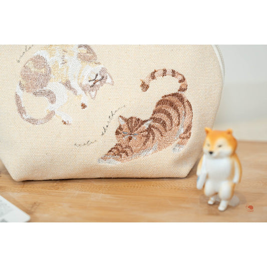 現貨 日本精選 慵懶貓咪 溫柔米色刺繡拉鍊 化妝包 收納包