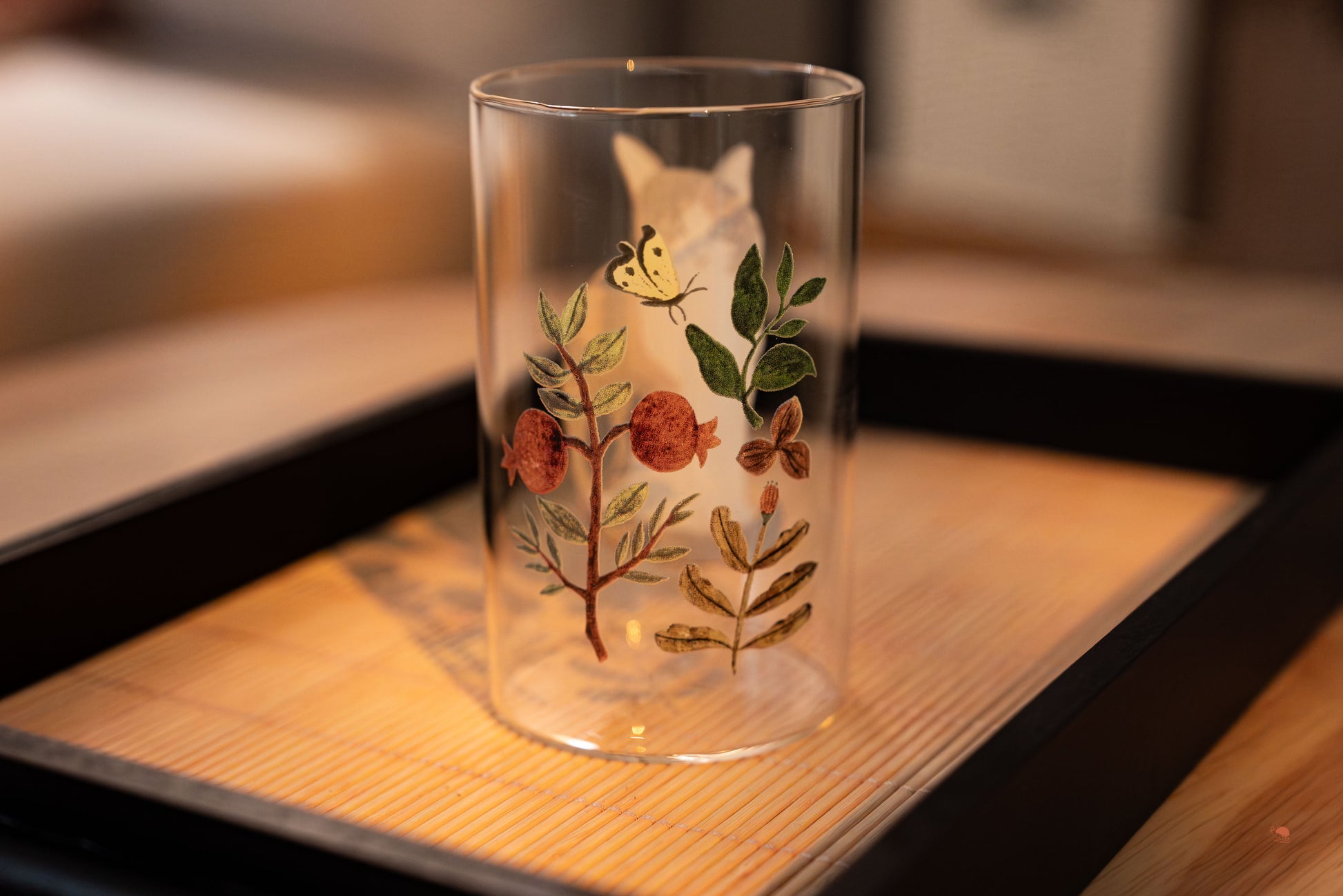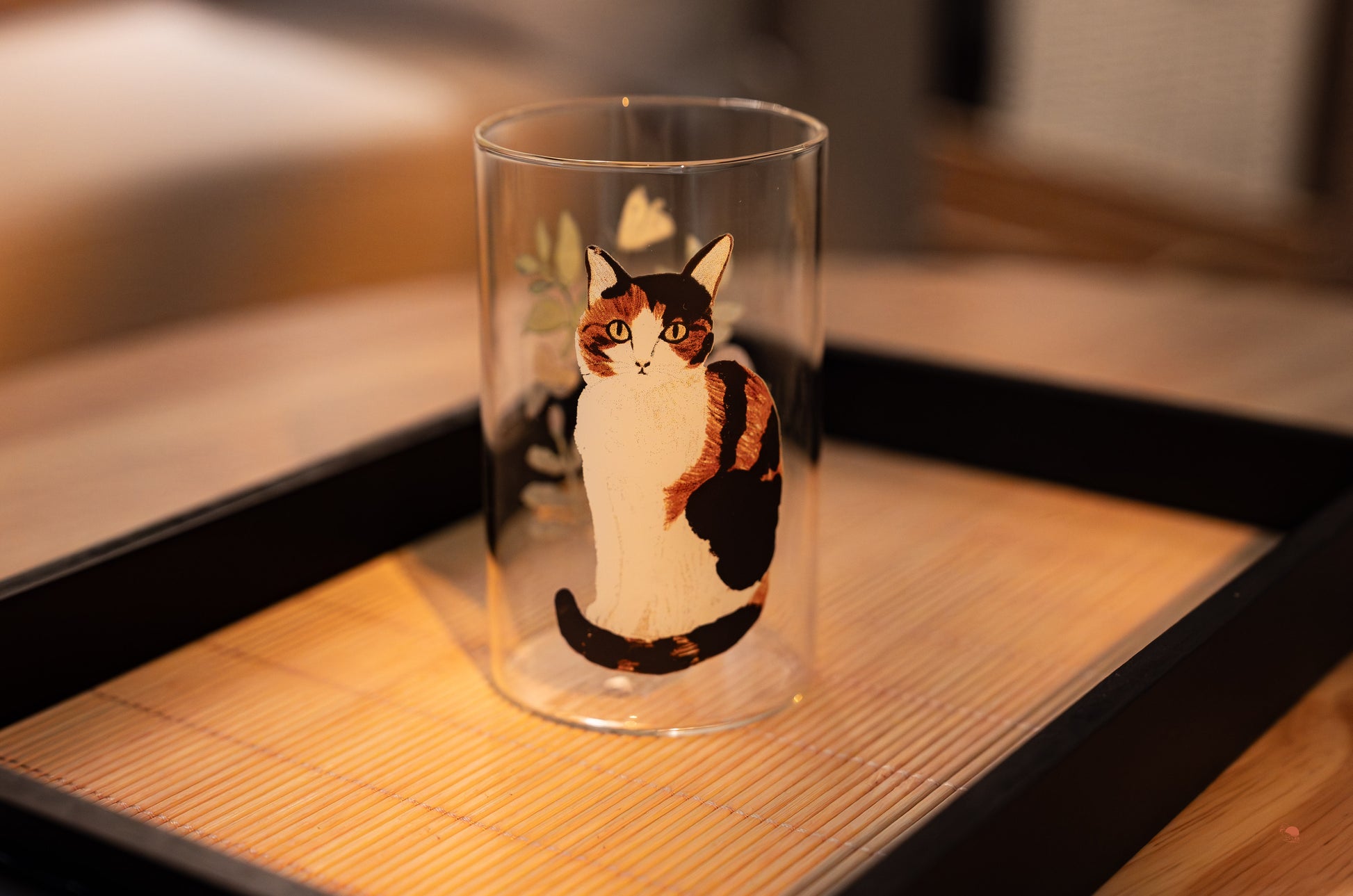清透的玻璃杯身上,一面是帶著溫柔眼神的氣質三花貓,另一面則是細緻入微的植物、果實與蝴蝶圖案。當你倒入牛奶或拿鐵時,白色的背景會讓貓咪與花草的色彩變得更加鮮明立體,宛如一件會變魔術的藝術品!