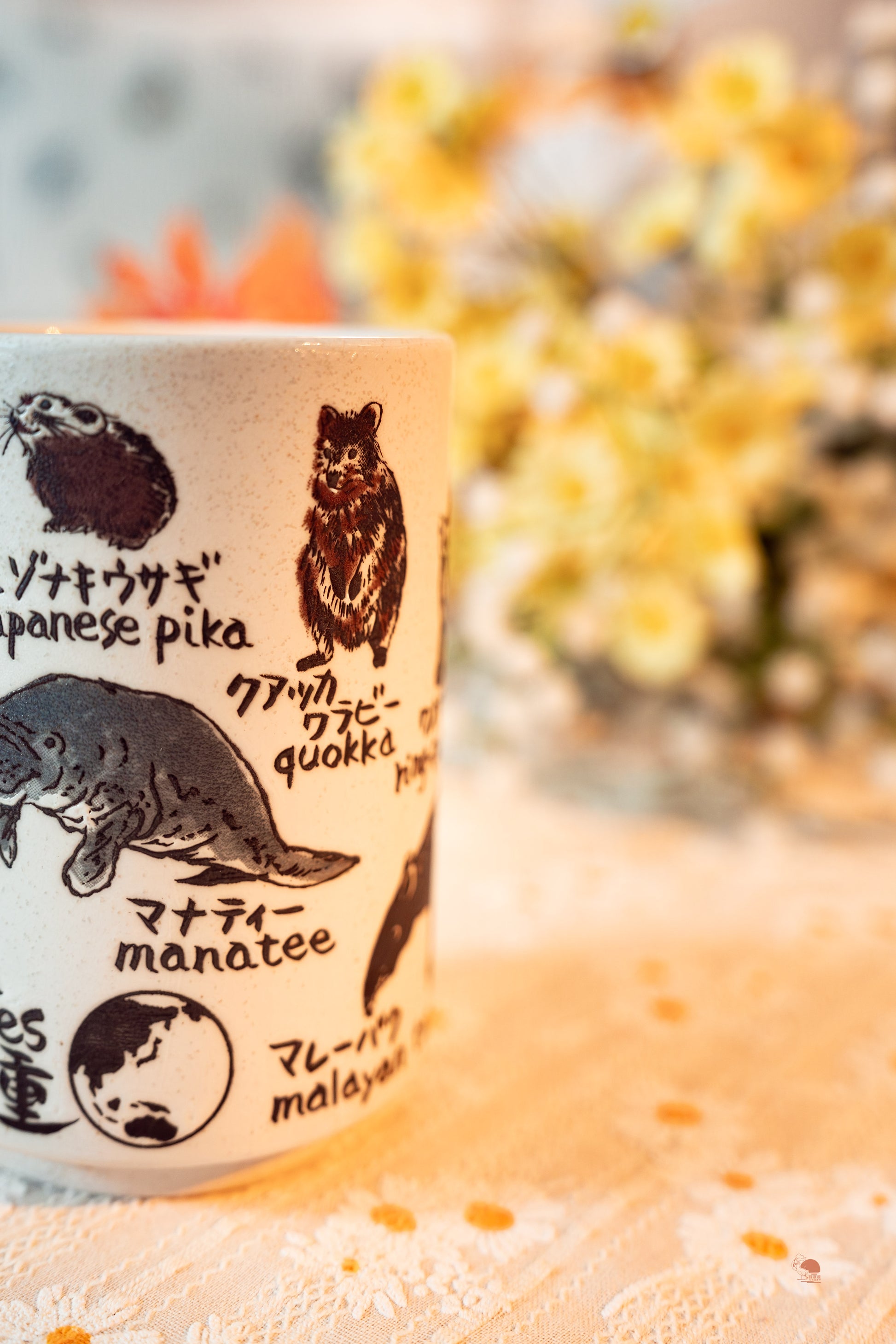 2️⃣ 活生生的動物百科全書:杯身環繞刻畫著世界各地正瀕臨絕種的珍稀動物,從神祕的鯨頭鸛、愛笑的短尾矮袋鼠,到慵懶的海牛與壯碩的北極熊。細緻的素描風格線條,搭配詳盡的物種名稱,讓您在飲水間如同翻閱一本精美的陶瓷自然圖鑑。