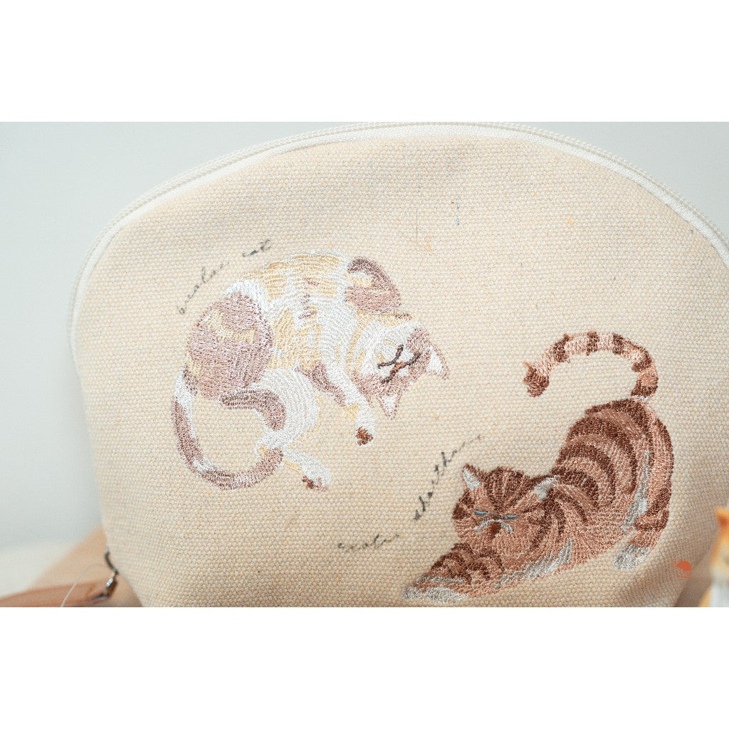 米色的帆布包面上,繡著兩隻正在午後打盹的加菲貓。上面那隻是粉嫩的三花貓,捲成一團睡得好香;下面那隻虎斑貓則是慵懶地伸懶腰,那個扁扁的臉蛋和放鬆的姿態,看著看著連自己的壓力都釋放了~🥺