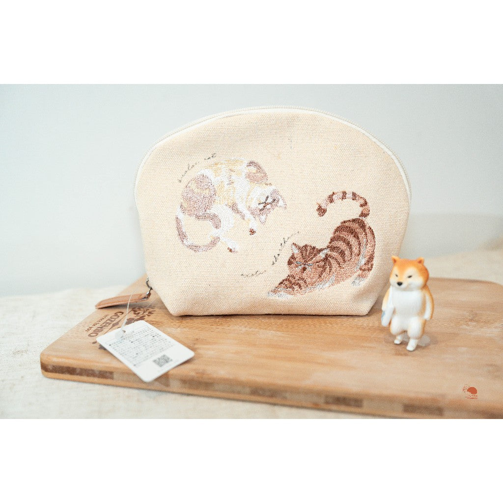 現貨 日本精選 慵懶貓咪 溫柔米色刺繡拉鍊 化妝包 收納包