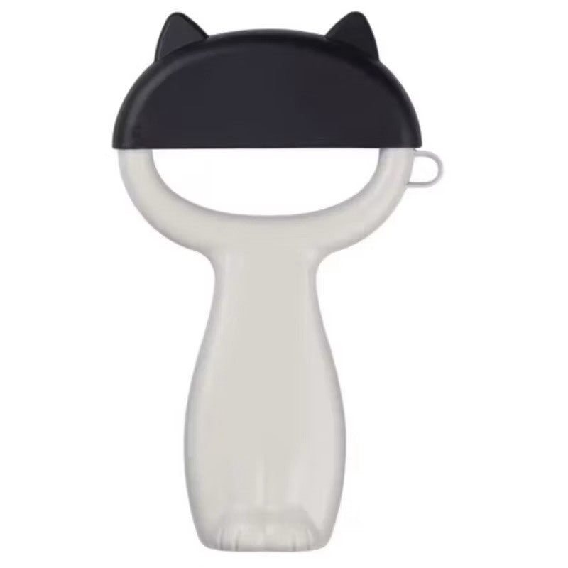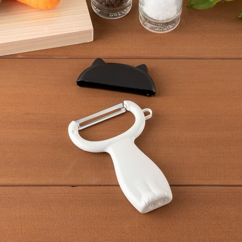 這款削皮刀最吸睛的亮點,就是那個黑色的「貓耳頭套」!平常不用的時候套上去,既安全又能保護刀片,看起來就像一隻戴著帽子的貓咪乖乖坐著。握柄的部分設計成貓咪白色的身體,符合人體工學超好握。