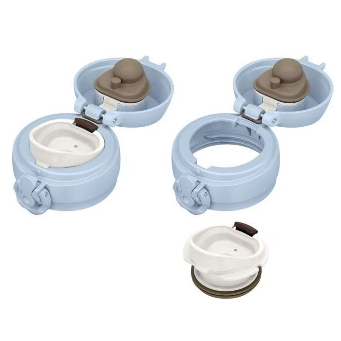 瓶身的顏色是那種非常舒服、帶點霧面質感的粉嫩淺藍色,上面用簡約的白色線條勾勒出兩隻坐在一起的 Miffy,畫面乾淨又療癒,完全展現了「Less is More」的日系極簡美學。這款是經典的 JNL 系列,擁有專利的「One Touch 彈蓋設計」,單手按壓就能輕鬆開蓋喝水,還附有安全扣環,放在包包裡也不怕誤觸漏水。💧