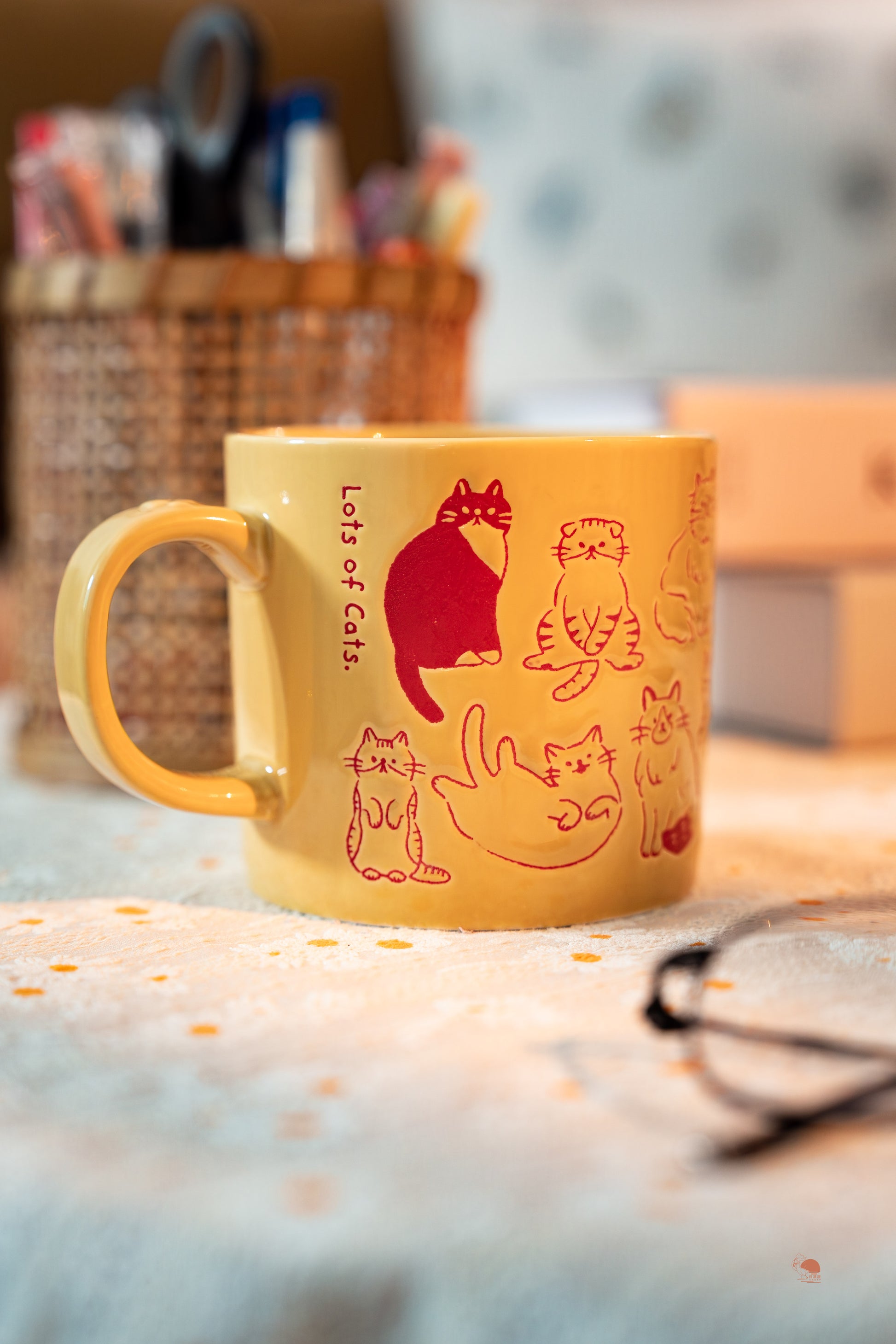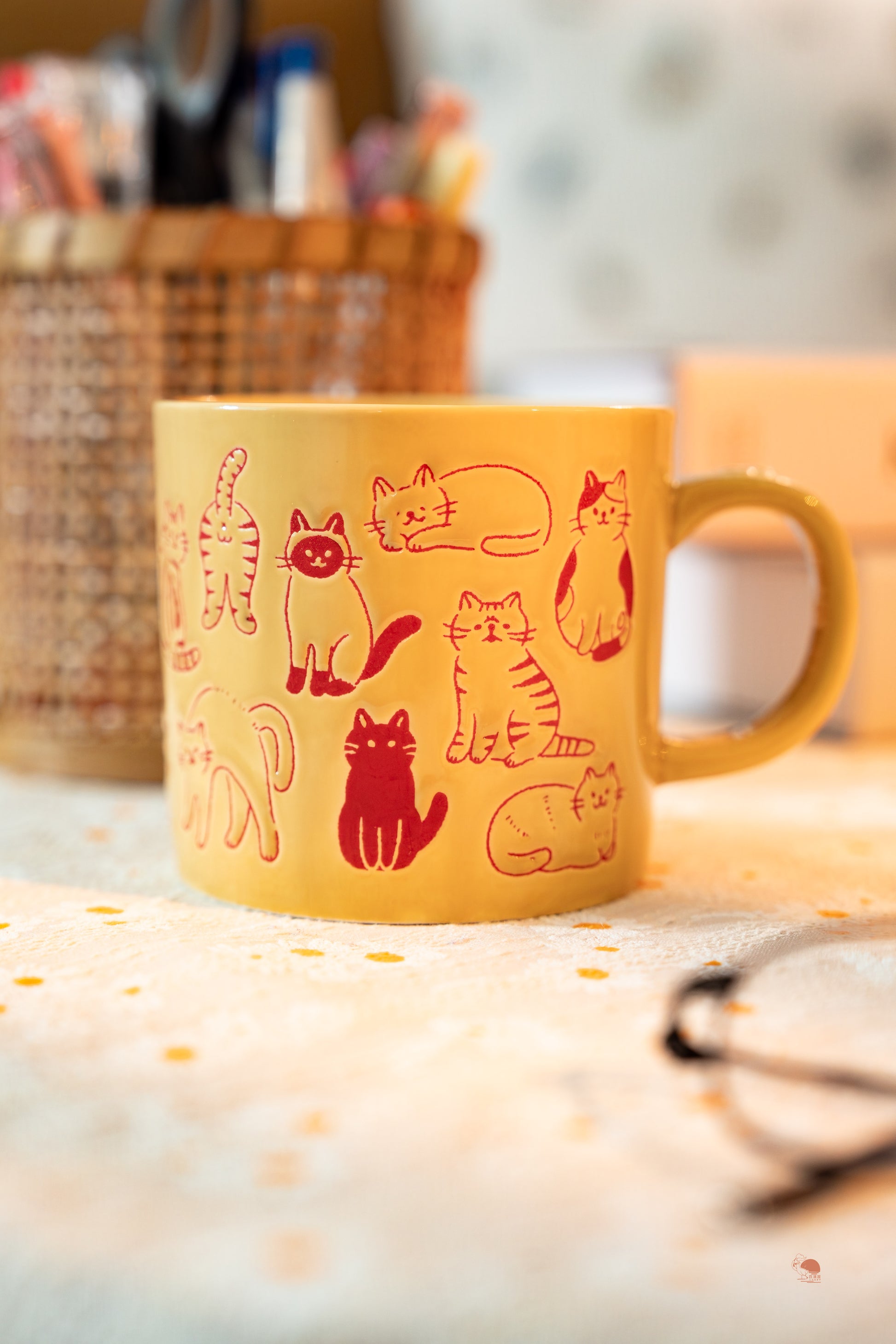 2️⃣ 滿版萌貓插畫:杯身環繞各式貓咪姿態,從伸懶腰到撒嬌,鮮活紅色線條搭配奶油黃底色,每次飲水都能與療癒眼神交會。