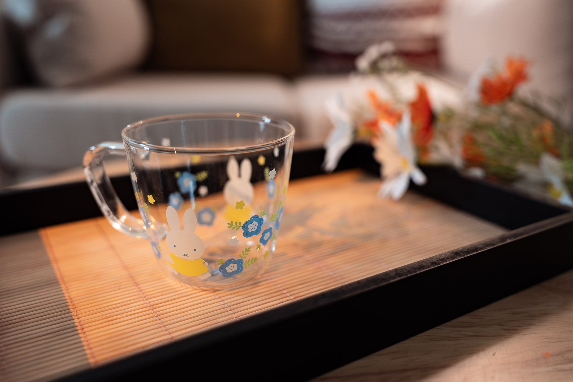 最迷人的瞬間,就是倒入牛奶或氣泡飲的時候!🥛 原本透明的背景瞬間染上顏色,讓藍色小花和米飛兔更加立體顯眼。 圓潤的杯身手感極佳,寬口徑設計方便清洗,也適合做優格杯或拿鐵杯。光線穿透玻璃灑落的影子,也是午後最療癒的風景。